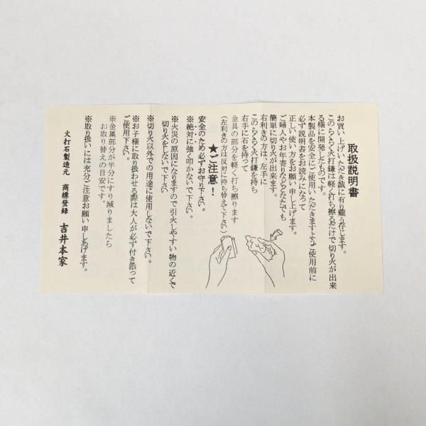※鎌は火打ち石に叩き付けず、マッチを擦る様にお使いいただくと小さな力で切り火が出ます。(また、鎌や石を痛める事も防げます)
